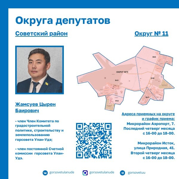 🔷 ️Избирательный округ №11 🔹 ️Округ №11 является одним из самых больших в Советском районе Улан-Удэ. На его территории расположена главная воздушная гавань Бурятии – международный аэропорт «Байкал», вокруг которого раскинулись микрорайоны с частной жилой застройкой. 🔹 ️Депутатом округа №11 является Цырен Баирович Жамсуев, член Комитета по градостроительной политике, строительству и землепользованию Улан-Удэнского городского Совета депутатов, член постоянной Счетной комиссии. 🔹 ️Больше всего, конечно же, местных жителей волнует разрешение вопросов сетевой инфраструктуры и благоустройства. В первую очередь это касается дорог, сетей электро- и водоснабжения. 📍 Адреса приемных на округе и график приема: 🔹 Микрорайон Аэропорт, 7. 📆Последний четверг месяца с 16-00 до 18-00. 🔹 ️Микрорайон Исток, улица Природная, 41. 📆Второй четверг месяца с 16-00 до 18-00. 🔎 Подробнее о том, какие улицы и товарищества входят в границы округа №11, в нашем канале MAX - https://max.ru/gorsovetul