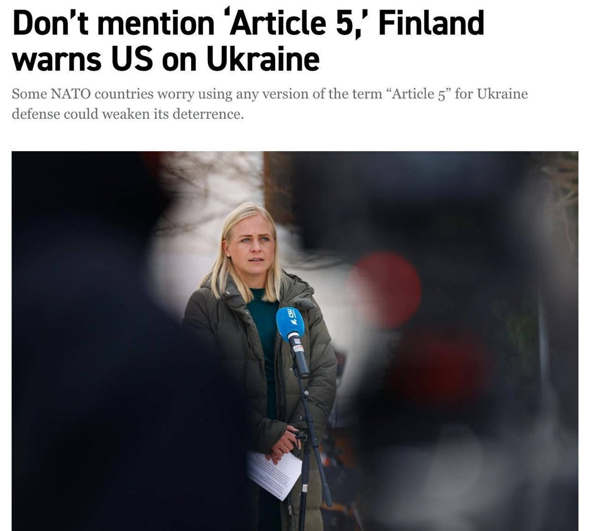 Об этом сообщает издание Politico со ссылкой на источники. По данным газеты, финские представители выразили опасения, что подобная формулировка может подорвать значение принципа коллективной обороны, лежащего в основе Североатлантического альянса. Кроме того, министр иностранных дел Финляндии Элина Валтонен, как отмечается в публикации, предостерегла конгрессменов США от заключения «слабого» мирного соглашения по Украине. Подписаться ✉️Обратная связь 🔼 Boost нашего канала🔼 📱Вконтакте 📱Одноклассники 📱Дзен