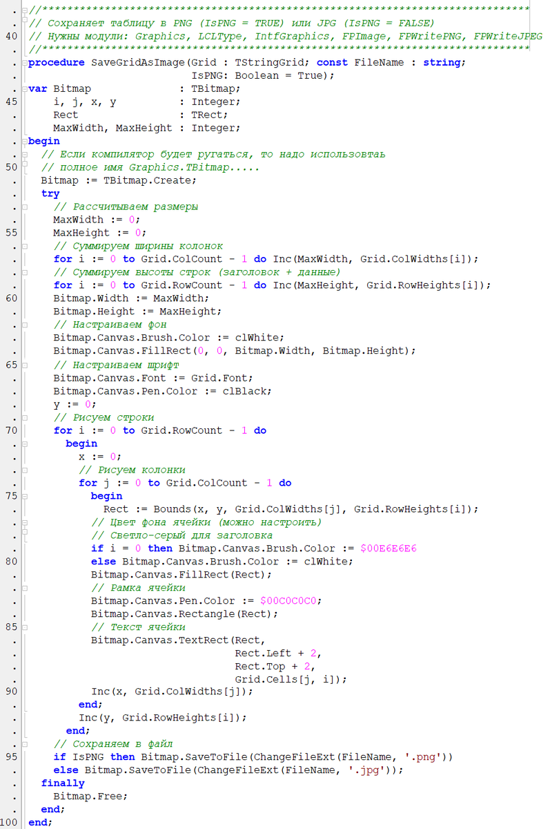Для автоматизации своей работы я создал и непрерывно дорабатываю программу в Lazarus IDE, с помощью которой формирую разные отчёты, разбираю файлы и т.п. Итоги я обычно вывожу в таблицу типа TStringGrid. Но если это надо только мне, то не вопрос. Однако часто приходится делиться этими отчётами с коллегами. Таблицу TStringGrid можно, например, сохранить в формате CSV. Это делается легко стандартными средствами примерно так: StringGrid.SaveToCSVFile('Файл таблицы.csv', ';'); Однако делиться отчётами часто приходится в Телеграм или МАХ, и на телефонах не у всех есть возможность посмотреть файл CSV, да и не всегда это удобно. Поэтому я обычно делаю копию экрана и отправляю в мессенджер картинку. Картинка там сразу видна - не надо ничего открывать. К тому же картинка цветная, где некоторые ячейки выделены цветом для лучшего понимая. Сделать копию экрана (скриншот) недолго и несложно. Однако всё равно это занимает время - надо сделать копию, обрезать лишнее (нужна ведь только часть окна, а