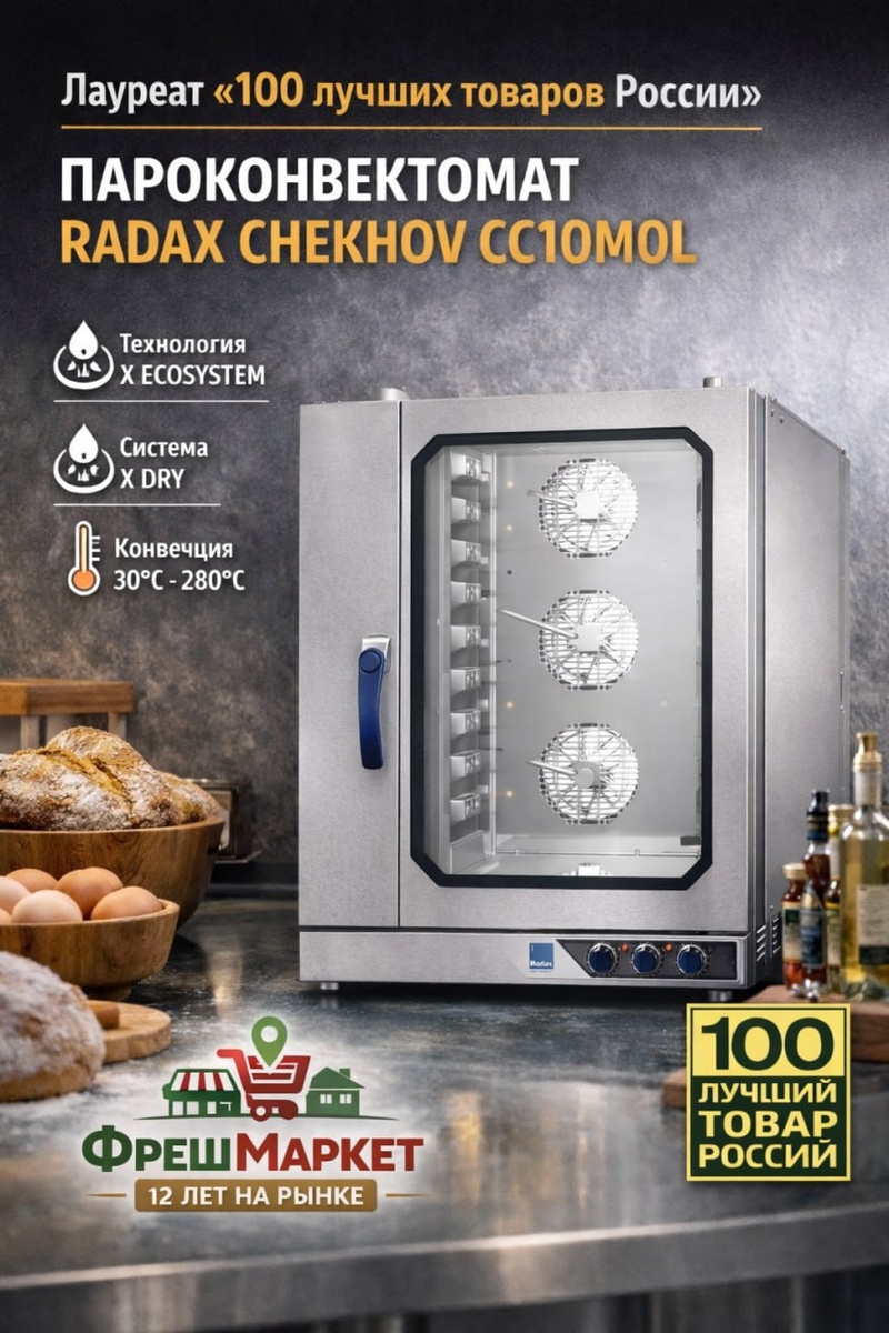 От классического наследия России — до современных технологических решений, которые сегодня уверенно конкурируют на рынке профессионального оборудования. 🏆 Пароконвектомат RADAX CHEKHOV CC10M0L — лауреат конкурса «100 лучших товаров России». Это профессиональная печь, созданная для стабильного и качественного выпекания хлебобулочных и кондитерских изделий. Реверсивные вентиляторы обеспечивают равномерный прогрев камеры и идеальные условия для каждого изделия. 💨 Технология X ECOSYSTEM формирует оптимальный микроклимат: — автономная подача пара и влаги — поддержание нужного уровня на всех этапах приготовления 🔥 Система X DRY эффективно удаляет излишки влаги, обеспечивая правильную текстуру и румяную корочку. Простое механическое управление, низкие затраты на обслуживание и высокая производительность делают эту модель отличным выбором для предприятий с высокой проходимостью. Ключевые характеристики: • Механическая панель управления • Мощность: 10,5 кВт | 400V | 50 Гц • Конвекция: