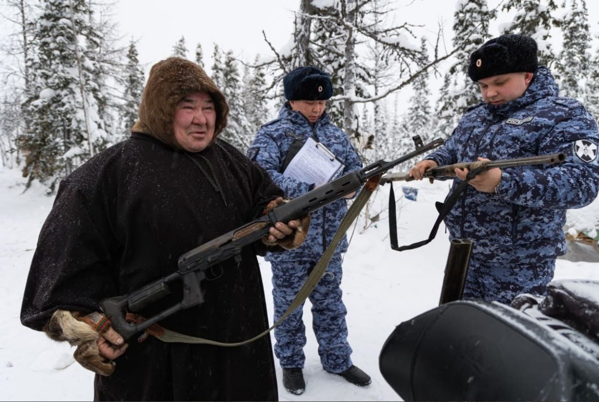 По данным регионального управления Росгвардии, на руках у охотников округа находится порядка 40 тысяч единиц огнестрельного оружия. Каждый ствол — будь то винтовка или карабин — обязан быть официально зарегистрирован. Особое внимание уделяется не только факту регистрации, но и соблюдению владельцами строгих правил хранения и использования оружия. Эти нормы действуют без исключений — как в городской черте, так и в условиях тундры, где оружие является частью традиционного уклада жизни. Проверка носит комплексный характер: чтобы добраться до отдаленных стойбищ, где проживают семьи оленеводов-кочевников, инспекторам приходится преодолевать значительные расстояния на снегоходах. Это позволяет контролировать соблюдение законодательства непосредственно на местах. 📸 Екатерина Боровикова
