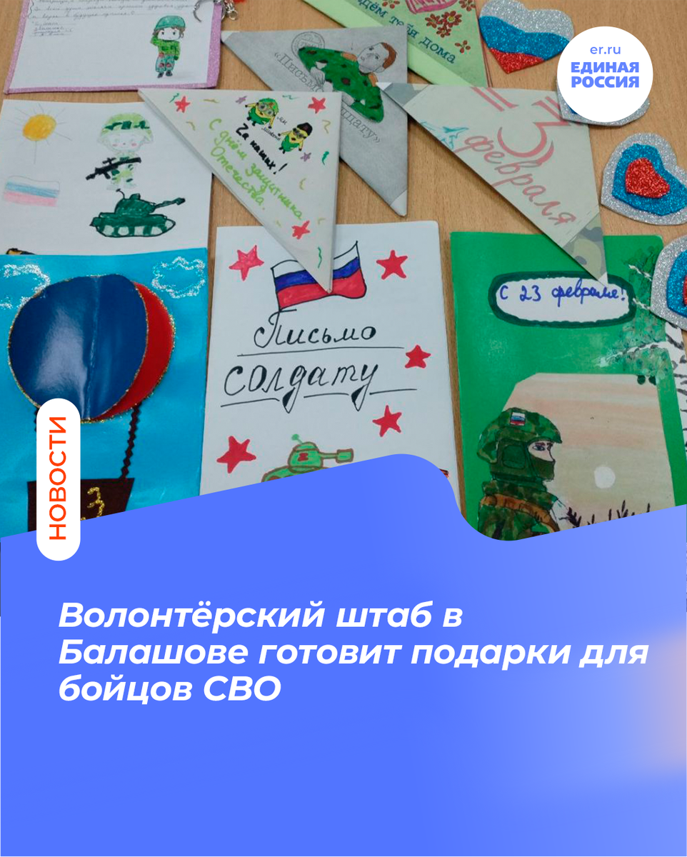 В преддверии празднования Дня защитника Отечества дети дошкольных и образовательных учреждений Балашовского района передали письма, открытки и сувениры для наших защитников в волонтёрский штаб Балашовского местного отделения Единой России.