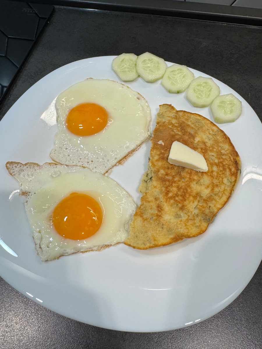 - Рядом: 2 яйца (для глазуньи), свежий огурец и побольше любимой зелени.