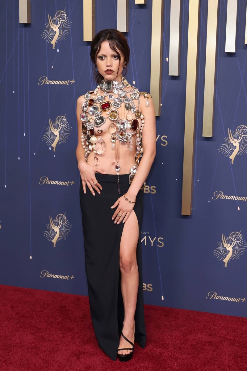 Актриса вышла на 77-ю церемонию Primetime Emmy Awards в сентябре в тяжёлом, почти скульптурном топе от Givenchy (дебютная коллекция Сары Бертон осень-зима 2025). Верх полностью усыпан огромными камнями, жемчугом и кристаллами — стилист потом признался, что конструкция весила 9–14 кг! В паре с чёрной юбкой в пол с высоким разрезом образ получился мрачным, интеллектуальным и идеально вписался в имидж «Wednesday». Многие сравнивали его с «Death Becomes Her» — готический шик в чистом виде. Чаппелл Роан на «Грэмми-2025» в архивном Jean Paul Gaultier