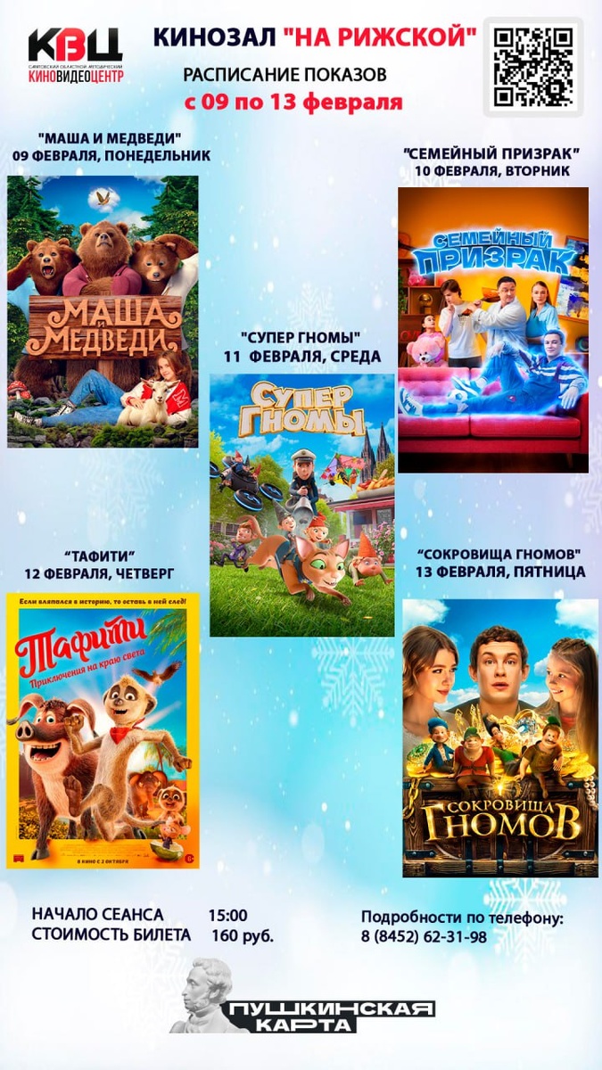🎥 Кинозал «На Рижской" - зимнее расписание с 9 по 13 февраля! Ждем всех в Саратовском областном методическом киновидеоцентре