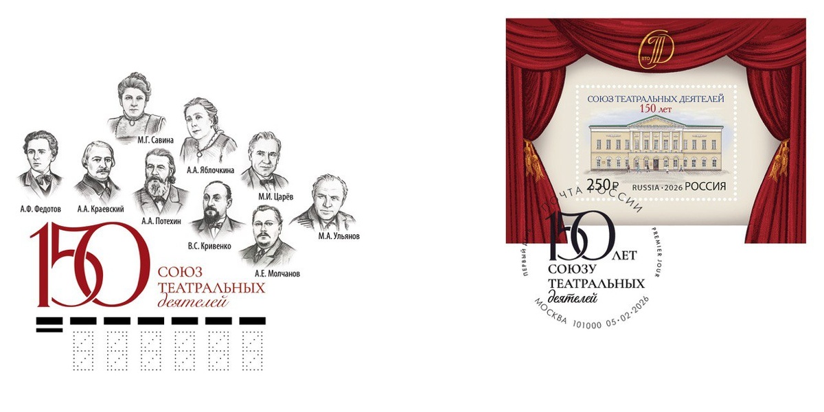 В год 150-летнего юбилея Союза театральных деятелей Российской Федерации (СТД РФ) в обращение вышла коллекционная почтовая марка и художественный конверт. К этому событию Почта России подготовила штемпель специального гашения. Выпуск приурочен к юбилейному году празднования, установленному Указом Президента России Владимира Владимировича Путина. Памятная марка номиналом 250 рублей, тираж которой составляет 16 тысяч экземпляров, представляет собой художественный блок. На ней изображено историческое здание СТД РФ на Страстном бульваре в Москве — знаковое место для нескольких поколений театрального сообщества. Особый интерес для коллекционеров и поклонников театра представляет тематический конверт. Следуя филателистической традиции, увековечены председатели организации, завершившие свой земной путь. Их портреты, размещенные в хронологическом порядке, отражают эволюцию от Общества взаимного вспоможения русских артистов (1876) через Русское театральное общество, Императорское Русское театр