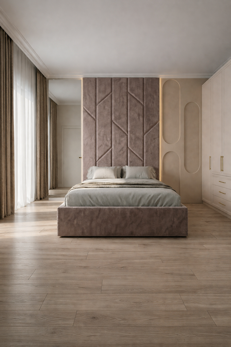 На фото — спальня, где акцентная стена стала ключевым элементом интерьера. Мягкие панели, выверенная геометрия, спокойная палитра и скрытая подсветка создают ощущение тишины, уюта и визуального баланса. Такой интерьер не устаёт со временем и остаётся актуальным годами.