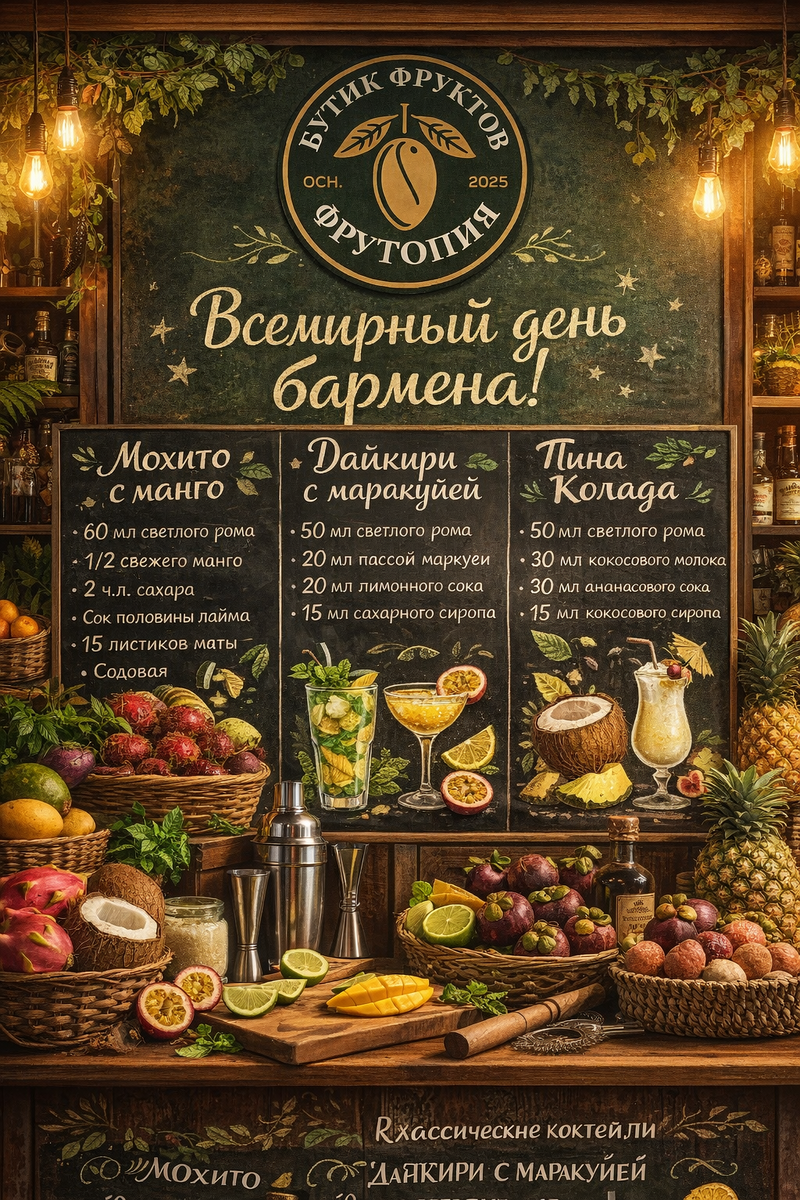 Иногда для маленького праздника не нужен повод. Но сегодня он есть — Всемирный день бармена. А значит, самое время замедлиться, налить что-нибудь в красивый бокал и создать настроение у себя дома. Домашние коктейли давно перестали быть чем-то сложным. Классический мохито, освежающий дайкири или нежная пина колада легко готовятся без профессионального оборудования. Главное здесь — не техника, а ингредиенты. 🥭 Экзотические фрукты решают всё Спелый манго даёт мягкую сладость, маракуйя — яркую кислинку и аромат, ананас добавляет тропическое настроение, а свежий лайм связывает вкус в идеальный баланс. Именно такие детали превращают обычный напиток в настоящий коктейль. Мы специально собрали на картинке несколько классических рецептов с экзотическим акцентом — их легко повторить дома, если под рукой есть качественные фрукты. 🍍 Почему важно выбирать правильные ингредиенты Экзотика не про «просто красиво». Это про вкус, аромат и сочность. Переспелый или, наоборот, недозрелый фрукт может испо