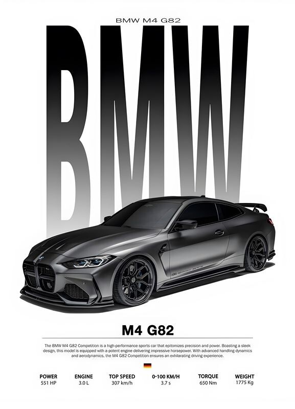 BMW M4 (G82) — это спортивное купе, которое дебютировало как часть седьмого поколения 4-й серии (G22/G23/G26). Модель G82 является преемником F82 и известна своим агрессивным дизайном и мощной производительностью. Вот основные характеристики и ключевые моменты, касающиеся кузова G82: Самой обсуждаемой особенностью G82, как и его "брата" M3 (G80), является массивная вертикальная решетка радиатора ("ноздри"), которая стала значительным отходом от предыдущих поколений BMW. M4 G82 оснащается двигателем семейства S58 — рядным шестицилиндровым двигателем с двойным турбонаддувом. Характеристика BMW M4 (G82) (Базовая) BMW M4 Competition (G82) двигатель S58 (3.0 л, рядная "шестерка", TwinPower Turbo); {S58} (3.0 л, рядная "шестерка", TwinPower Turbo) Мощность Около 480 л.с. Около 510 л.с. Крутящий момент Около 550 Нм Около 650 Нм Трансмиссия | 6-ступенчатая механическая (только для базовой версии) 8-ступенчатый M Steptronic} (автомат) Привод | Задний (RWD) | Задний (RWD); позже появился полный