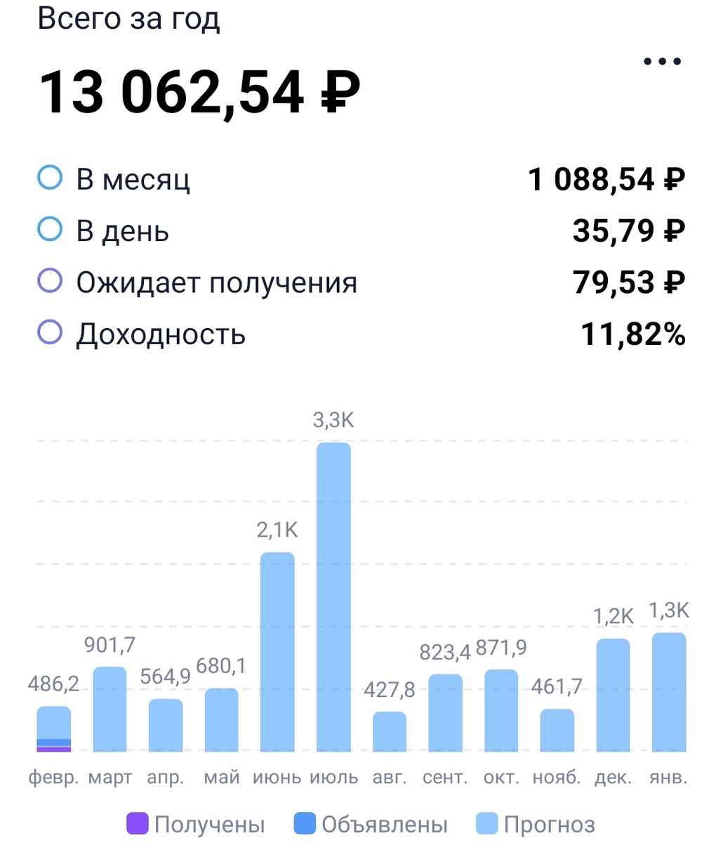 Основная цель портфеля - купонно-дивидендный доход. В приложении по учёту инвестиций сейчас такая картина на ближайший год: