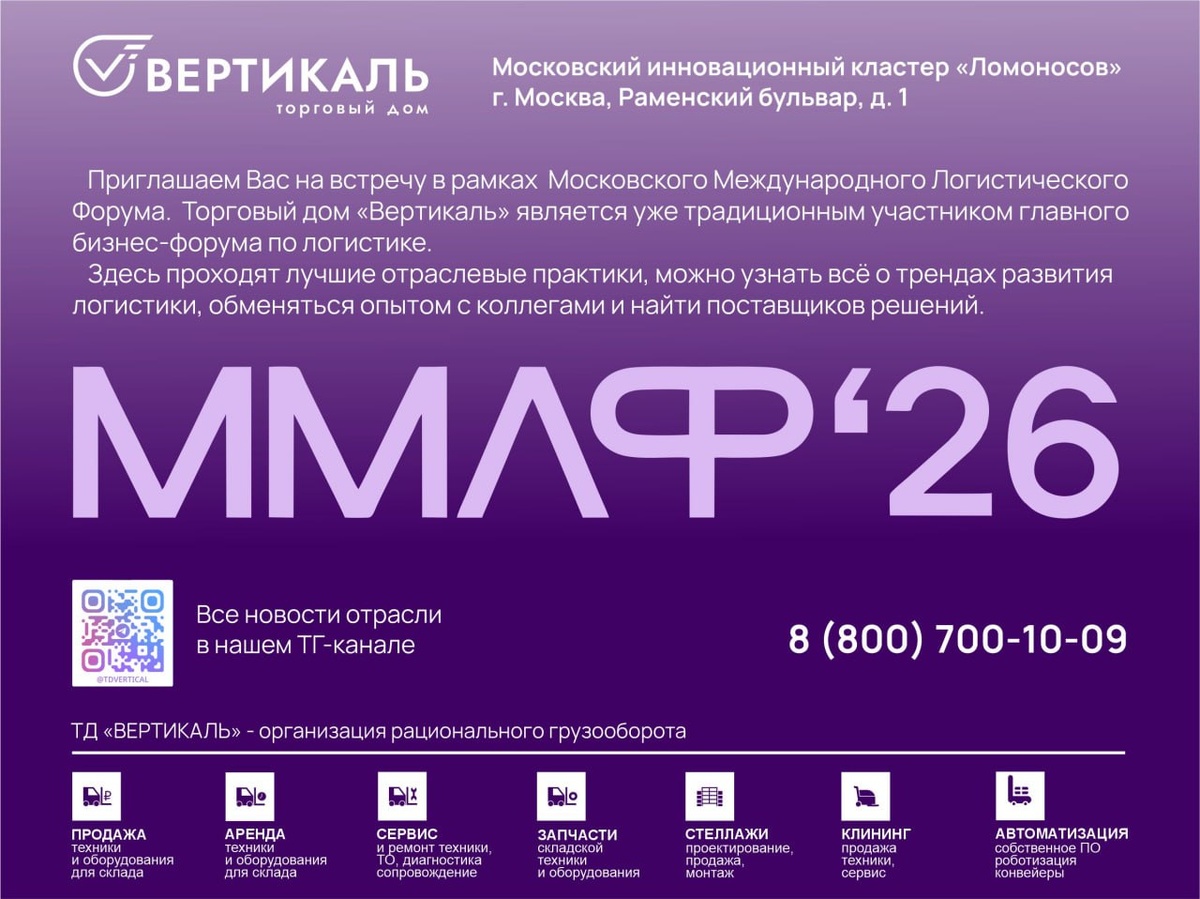 ! 2-6 марта мы принимаем участие в Московском Международном Логистическом Форуме🔥 Торговый дом «Вертикаль» является уже традиционным участником главного бизнес-форума по логистике💪 Здесь проходят лучшие отраслевые практики, можно узнать всё о трендах развития логистики, обменяться опытом с коллегами и найти поставщиков решений. Мы представим все наши направления: - продажа техники и оборудования для склада - техника и оборудование для склада в аренду - сервис и ремонт - запчасти - стеллажные системы - автоматизация и роботизация - клининговое оборудование Приглашаем Вас на встречу в рамках Форума! Место: Московский инновационный кластер «Ломоносов», г. Москва, Раменский бульвар, д. 1