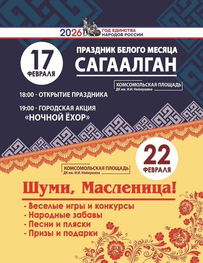 Это праздник, который символизирует прощание с зимой и встречу весны, с давних времен является временем веселых гуляний и щедрых угощений. В этом году праздник «Шуми, Масленица!» традиционно пройдет на Комсомольской площади у Дворца культуры имени И. И. Наймушина. Здесь оживут старинные традиции, зазвучат весёлые песни, развернутся забавы и обряды. Гости смогут поучаствовать в народных играх и соревнованиях в ловкости и силе. В программе — хороводы, частушки и состязания. А в воздухе будет аромат свежих блинов. Приглашаем всех — семьи, друзей и соседей. Вместе встретим весну и проводим зиму шумно и радостно. Пусть праздник подарит каждому тепло и радость. Ждём вас на Комсомольской площади. Не пропустите этот яркий и тёплый праздник! 22 февраля, 13:00 Вход свободный 0+