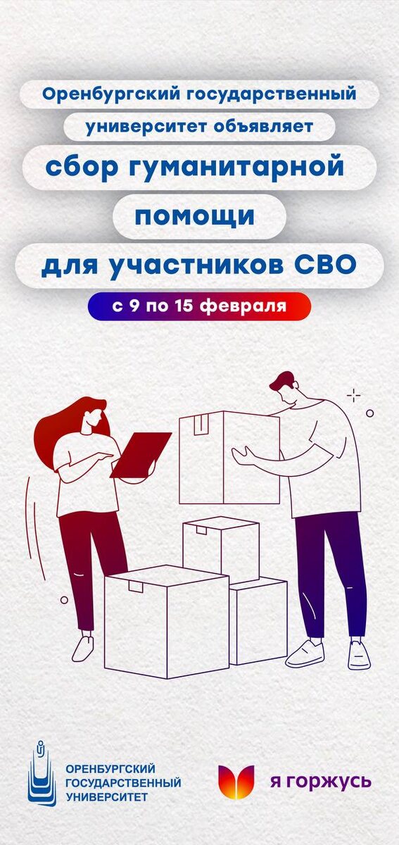 Оренбургский государственный университет присоединился к региональной акции по сбору помощи для участников специальной военной операции. Акция проходит по инициативе губернатора области Евгения Солнцева, а собранный груз будет направлен в зону проведения СВО в преддверии Дня защитника Отечества. Сдать необходимые вещи можно будет с 9 по 15 февраля в специально организованных пунктах сбора на всех факультетах и институтах ОГУ. С 16 по 18 февраля вся гуманитарная помощь будет передана в университетский штаб общероссийской акции #МЫВМЕСТЕ, чтобы стать частью общего регионального конвоя. Организацией сбора занимаются факультеты, институты университета и студенческий патриотический клуб «Я горжусь». Подробный перечень необходимого можно посмотреть в специальных карточках 🔼 👥 Важное условие: продукты в стеклянной упаковке не принимаются. Присоединяйся к важной акции в поддержку защитников Отечества! 🇷🇺 Мы в MAX #ОГУ #в_ОГУ #OSU #добровольцыОренбуржья #МЫВМЕСТЕ #ЯГоржусь #ЯгоржусьО