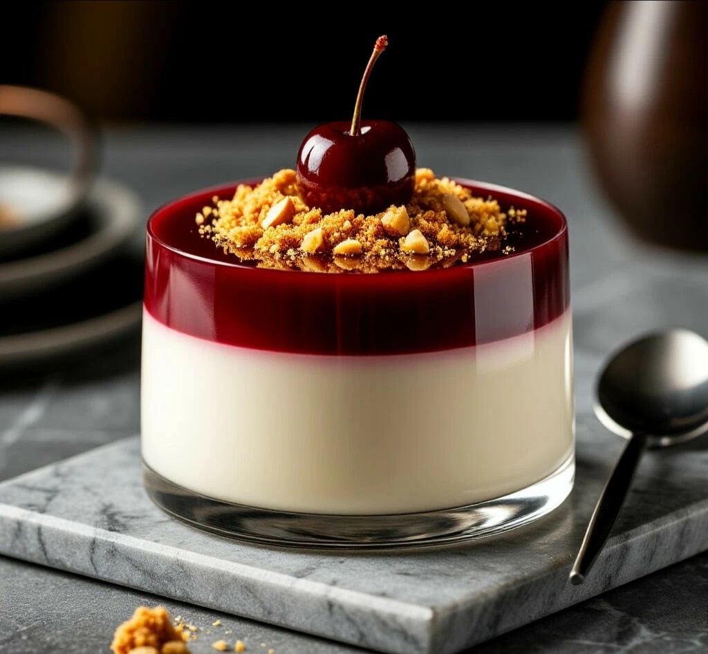 4. Собираем слои! Когда панна-котта полностью застыла, аккуратно вылить на каждую порцию остывший вишневый гель. Снова убрать в холодильник до полного застывания геля (1-2 часа). ⏳