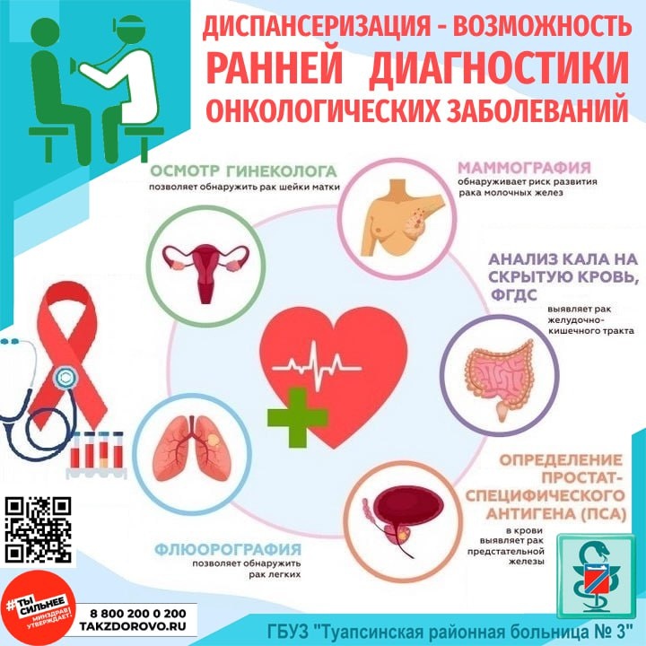 ? ⭕️ Флюорография - позволяет обнаружить рак легких. ⭕️ Анализ кала на скрытую кровь, ФГДС - выявляют рак желудочно-кишечного тракта. ⭕️ Осмотр гинеколога - позволяет обнаружить рак шейки матки. ⭕️ Маммография - обнаруживает риск развития рака молочных желез. ⭕️ Определение простат-специфического антигена (ПСА) в крови - выявляет рак предстательной железы. ✅ Все вышеперечисленные процедуры Вы можете пройти бесплатно в рамках диспансеризации. ПРОФИЛАКТИКА ОНКОЛОГИЧЕСКИХ ЗАБОЛЕВАНИЙ ⚠️ Для снижения риска развития злокачественных новообразований, необходимо: ❗️ Отказаться от курения. ❗️ Регулярно заниматься спортом. ❗️ Ежедневно употреблять растительную и молочную пищу. ‼️ Проходить профилактический медицинский осмотр и диспансеризацию в поликлинике. Подробнее о прохождении профилактических осмотров и диспансеризации на нашем сайте: https://hosp23.ru/patients/screening/710-minzdravkkodispanserizacii.html #укреплениеобщественногоздоровья