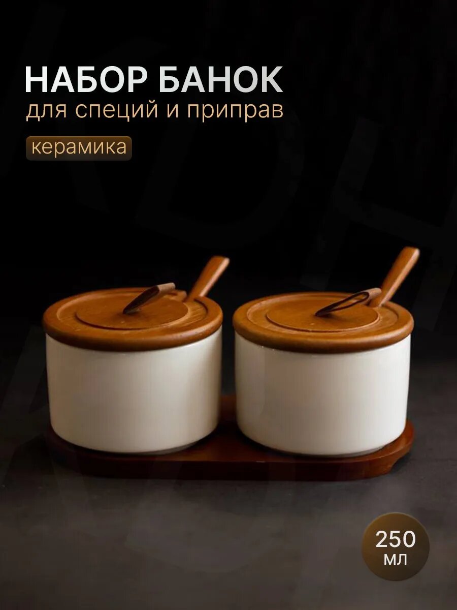 Набор из двух керамических банок по 250 мл с деревянными крышками и ложками. В комплекте деревянная подставка. Дизайн в сочетании белой керамики и натурального дерева.