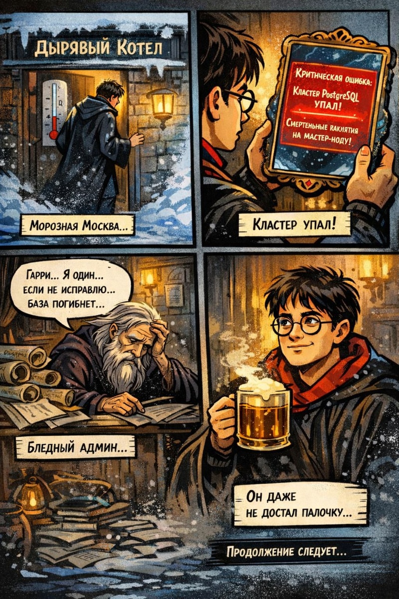 Гарри пробирался сквозь ледяную мглу февральской Москвы. Термометр у входа в «Дырявый котел» на Цветном показывал −19°C, а колючий ветер пробирал до костей даже сквозь мантию с подогревом. Сегодня была та самая встреча в Министерстве Цифровой Магии, к которой он готовился месяцами. Но стоило Гарри переступить порог, снять перчатки и заказать сливочное пиво, как его зеркало-связной бешено завибрировало.💡 Надпись на стекле вспыхнула алым светом: «Критическая ошибка: Кластер PostgreSQL упал. Смертельные заклятия сыплются на мастер-ноду».😡❗️ Гарри медленно вздохнул. День только начинался... В углу кафе он заметил знакомую фигуру — штатного мага-админа из министерства. Тот выглядел бледным, словно увидел дементора.🎩💻 — Гарри… это конец, — прошептал он. Я дежурил всю неделю. Я один знаю, как работает эта древняя магия конфигов. Если сейчас не разберусь — база превратится в тыкву. Он нервно перелистывал старые свитки документации.📖✏️ — А мне ещё нужно заполнить отчёты о расходе летучего