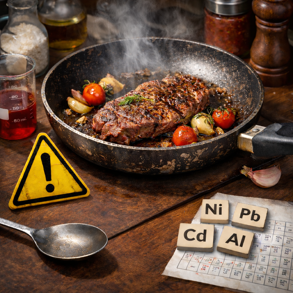 Мы привыкли считать посуду чем-то вроде декорации на кухне. Сковорода жарит, кастрюля варит - и всё, больше от неё ничего не требуется. Главное ведь, что? Свежие продукты, хороший рецепт и золотые руки. Но вот незадача: посуда иногда решает внести в блюдо свою лепту. Причём без спроса. Тайный ингредиент, о котором вы не просили Представьте обычный вечер: вы жарите стейк, тушите рагу или колдуете над соусом болоньезе. Классика. Только вместе с солью, перцем и лавровым листом в ваш ужин могут попасть незваные гости - микрочастицы металлов. Нет, это не диверсия. Просто материал посуды при нагревании и контакте с едой имеет обыкновение делиться своими составляющими. Совсем чуть-чуть, но регулярно. Именно это явление изучали учёные в исследовании с говорящим названием «Assessing Leaching of Potentially Hazardous Elements from Cookware during Cooking» («Оценка вымывания потенциально опасных элементов из кухонной посуды во время приготовления пищи»). Короче говоря, проверяли, не слишком ли ак
