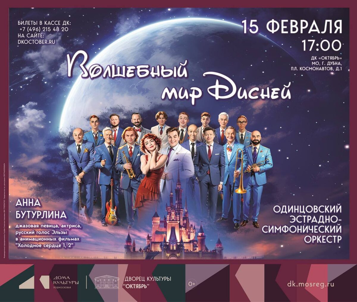 ! 15 февраля, в воскресенье, на сцене ДК «Октябрь» состоится яркое культурное событие — шоу-программа «Волшебный мир Disney». Известные мелодии из «Короля Льва», «Русалочки», «Холодного сердца», «Принцессы и лягушки» и других классических мультфильмов прозвучат в исполнении Одинцовского эстрадно-симфонического оркестра под управлением дирижёра Юрия Ковешникова. 🎤 Звезда вечера — джазовая певица и актриса мюзиклов Анна Бутурлина — официальный русский голос Королевы Эльзы и Принцессы Тианы. Артистка, известная своими выступлениями на церемонии «Оскар» и в ООН, исполнит вокальные партии. 👨👩👧👦 Программа отлично подходит для семейного просмотра: выступление оркестра и вокалистки будет сопровождаться тематическим видеорядом, а для юных зрителей предусмотрены интерактивные элементы с аниматорами. 🗓 Когда: 15 февраля (воскресенье) в 17:00 📍 Где: Дубна, ДК Октябрь 🎁 Промокод на скидку 15% — DUBNA1 👉 БИЛЕТЫ – https://68f934a755d5151c43efe2ae.ticketscloud.org/e/69136a6df6770faf7a