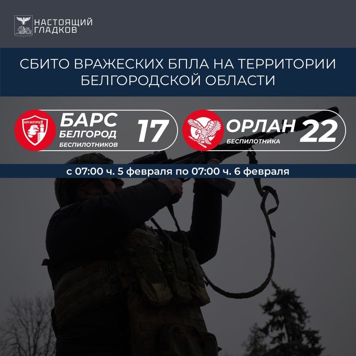» С 07:00 ч. 5 февраля по 07:00 ч. 6 февраля ликвидированы 39 беспилотников «БАРС-Белгород» — 17 беспилотников:** 📍подавлены РЭБ: — Краснояружский округ: 8 FPV-дронов; — Валуйский округ: 1 FPV-дрон. 📍 сбиты из стрелкового оружия: — Белгородский округ: 1 БПЛА самолётного типа; — Грайворонский округ: 4 FPV-дрона. 📍 средствами противодействия БПЛА сбиты: — Белгородский округ: 1 БПЛА типа «Дартс»; — Шебекинский округ: 1 разведывательный БПЛА "Лелека 100"; 1 разведывательный БПЛА "ГОР". **«Орлан» — 22 беспилотника: ** 📍подавлены РЭБ: — Белгородский округ: 6 FPV-дронов; — Валуйский округ: 1 FPV-дрон; — Краснояружский округ: 1 FPV-дрон. 📍 сбиты из стрелкового оружия: — Борисовский округ: 1 FPV-дрон; — Грайворонский округ: 3 FPV-дрона; — Шебекинский округ: 3 FPV-дрона. 📍 подавлены РЭБ совместными усилиями подразделения «ОРЛАН» и бойцов самообороны: — Шебекинский округ: 7 FPV-дронов.