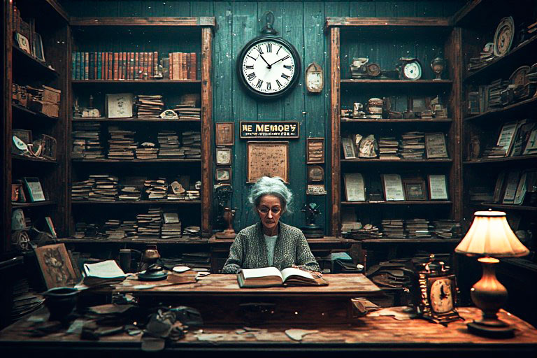 Внутри пахло старыми книгами, сушёной ромашкой и чем-то ещё - сладковатым, как воспоминание о детстве. Полки были заставлены потрепанными фолиантами. В основном это были сборники произведений классиков вроде Толстого, Достоевского и иже с ними. В центре стоял массивный дубовый стол, а за ним - пожилая женщина с седыми волосами, убранными в тугой узел. На стене висели часы, но стрелки на них двигались странно - рывками, замирая на месте.