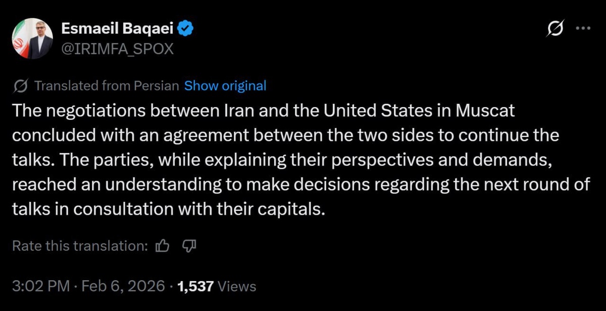 Результатом переговоров между США и Ираном в Омане стало соглашение сторон о продолжении переговоров в дальнейшем, заявил представитель МИД Ирана Эсмаил Багаи. "Переговоры между Ираном и Соединенными Штатами в Маскате завершились соглашением между двумя сторонами о продолжении переговоров. Стороны, объясняя свои точки зрения и требования, достигли понимания о том, чтобы принять решения относительно следующего раунда переговоров в консультации со своими столицами", - написал Багаи. Что-то это все напоминает. #Иран Военный Осведомитель
