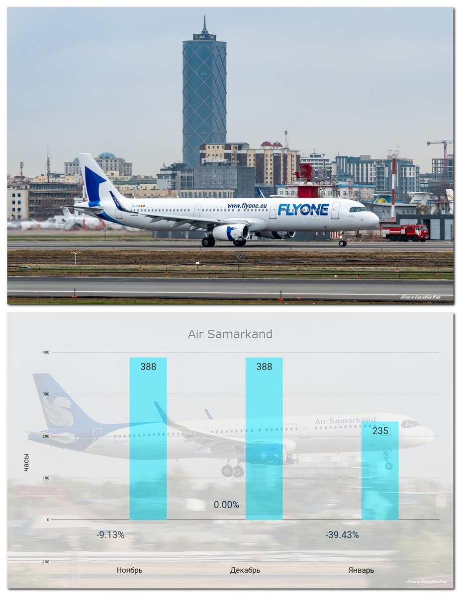 В январе единственный оставшийся борт авиакомпании Airbus A321- UK32120 начал проходить техническое обслуживание, поэтому налёт стал меньше. Рейсы за авиакомпанию на условиях мокрого лизинга продолжают выполнять Boeing 767 JY-JAL авиакомпании Jordan Aviation и 2 Airbus A321 - YR-FIB, YR-FIC авиакомпании FlyOne. Количество часов налёта самолёта авиакомпании Air Samarkand за январь уменьшилось 🔽 на 39.43% по сравнению с декабрём и составило 235 часов. Общая динамика за последние 3 месяца представлена на графике. #статистика #airsamarkand #январь2026