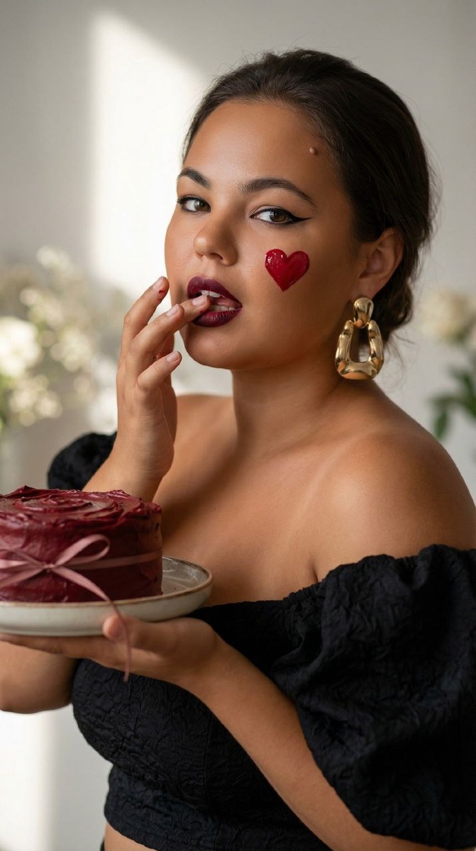 😀Выбираем "нейросети" 😀Нажимаем "Nano Banana" 😀Нажимаем "Nano Banana Pro" 😀Прикрепляем через скрепку свое фото и выбранный промпт 😀Наслаждаемся результатом😍 Не меняя внешности женщины, она стоит в полуобороте к камере на фоне мягко размытых теней и светлых цветов, создающих атмосферу изысканного минимализма. Кожа ровным бронзовым оттенком, спина и плечи обнажены, черный топ с объемной тканью контрастирует с кожей, добавляя глубину. Женщина смотрит в камеру с дерзким игривым выражением, губы насыщенного винного цвета, изящные черные стрелки подчёркивают глаза, создавая мистическое настроение. Ярко-красное глянцевое сердце на щеке — элемент кокетства. Золотистые массивные серьги ловят свет, расширяя палитру. Рука у губ в полуоткрытом жесте, другая держит тарелку с темно-красным тортиком с тонкой лентой, текстура крема видна аппетитно. Мягкий свет слева сверху формирует нежные тени, подчёркивающие рельеф и объем. Фон гладкий, слегка контрастный, создаёт камерность и интимность. Кол