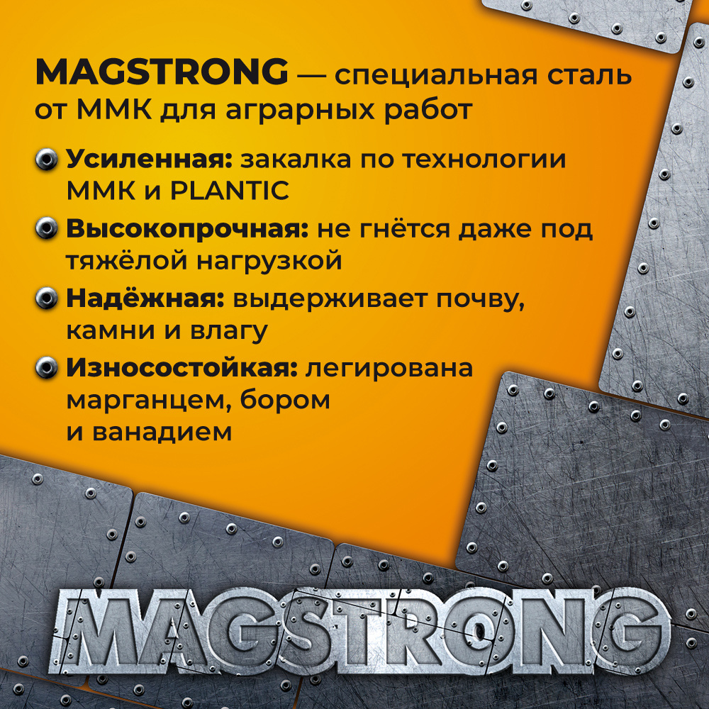 В некоторых моделях лопат PLANTIC мы используем сталь MAGSTRONG, разработанную Магнитогорским металлургическим комбинатом специально для аграрных работ. MAGSTRONG - это прочная основа для лезвий лопат, способная выдерживать тяжелые работы с почвой, камнями и взаимодействовать с влагой сезон за сезоном.