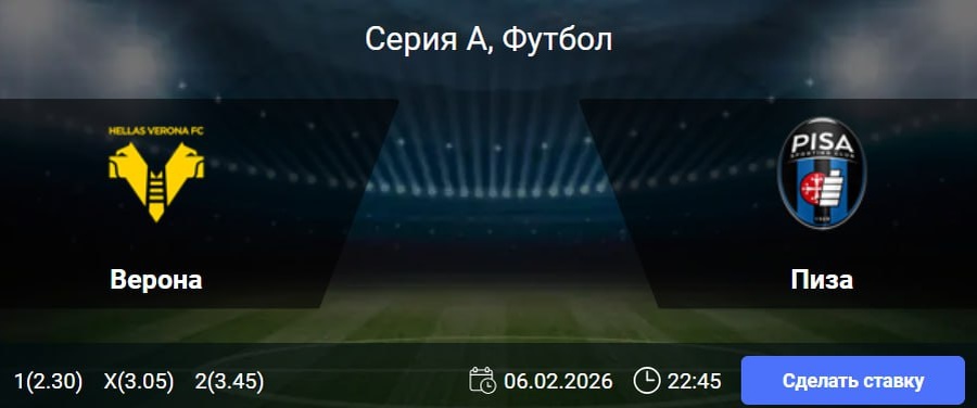 Статистика Вероны: В 10 из 12 предыдущих матчей «Вероны» в Серии А голы забивались в обоих таймах. На домашней арене команда не смогла одержать победу в 16 из 17 последних игр чемпионата, девять раз проиграв и семь раз сыграв вничью. В шести из восьми предыдущих домашних встреч в рамках турнира клуб пропускал как минимум два гола. Статистика Пизы: В пяти из шести последних матчей клуба в Серии А обе команды забивали. Шесть из восьми предыдущих выездных игр «Пизы» в чемпионате завершились вничью. В шести из восьми последних гостевых поединков в рамках турнира команда забивала не менее двух мячей. 🎯 ТБ (2) 🎲 кф (1.76) 👉 СДЕЛАТЬ СТАВКУ 🎁 ФРИБЕТ WINLINE - 3000₽ (промокод: BETWIN) 👉 СМОТРЕТЬ ПРОГНОЗ