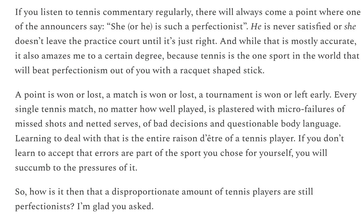 : Теннис — это спорт, который выбивает перфекционизм из тебя палкой в форме ракетки 😂 Каждый теннисный матч, каким бы хорошим он ни был, испещрен микро-провалами из-за пропущенных ударов и подач в сетку, плохих решений и сомнительного языка тела. Научиться справляться с этим — вот в чем смысл существования теннисиста. Если вы не научитесь принимать, что ошибки являются частью спорта, который вы выбрали для себя, вы поддадитесь его давлению. Перфекционизм идеален, пока он сдерживается нашим будущим, лучшим "я". Полная статья здесь: [https://andreapetkovic.substack.com/p/about-perfectionism](https://andreapetkovic.substack.com/p/about-perfectionism) Подпишись на Эйс и точка