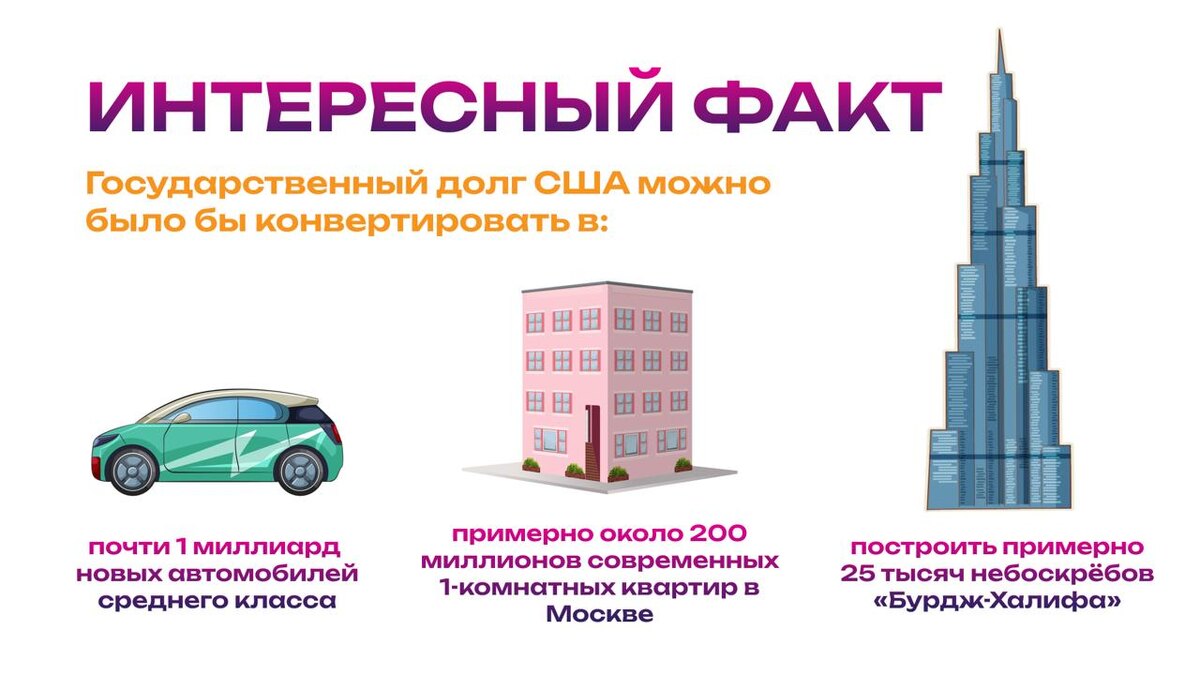 ? Государственный долг США — одна из самых обсуждаемых экономических величин в мире. Его текущий размер составляет $38 трлн. Попробуем понять масштаб этой цифры через сравнение. Вот во что можно было бы его конвертировать: 👉 Автомобили: Это почти 1 миллиард новых автомобилей среднего класса. 👉 Жильё: Сумма эквивалентна примерной стоимости около 200 миллионов современных 1-ком квартир в Москве 👉 Строительство: На эти деньги можно было бы построить примерно 25 тысяч небоскрёбов «Бурдж-Халифа» (самое высокое здание в мире). Почему такие гигантские суммы — это не равно краху? Для экономики ключевое — не сам размер долга, а способность его обслуживать. США, обладая самой большой экономикой (ВВП ~$28 трлн) и контролируя главную мировую валюту, пока успешно управляют этими обязательствами. Их долг — это, по сути, глобальные облигации, в которые охотно инвестируют другие страны и компании по всему миру. А какое сравнение для вас самое впечатляющее? Отметьте в реакции 💯 - автомобили