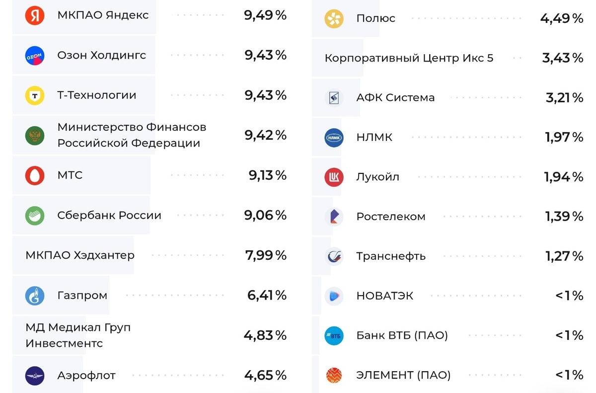 » Посмотрим, что поменялось за последний месяц Данные по состоянию на 29.12.2025 → 30.01.2026 📱Яндекс — 9,5% → 9,49% 🏦Т-Технологии — 9,58% → 9,43% 📦Озон — 9,62% → 9,43% 🏛ОФЗ — 13,4% → 9,42% (-4%🔽) 📱МТС — 9,01 % → 9,13% 🏦Сбер — 9% → 9,06% 🔖Хэдхантер — 7,91% → 7,99% ⛽️Газпром — 2,06% → 6,41% (x3🔼) 🩺Мать и Дитя — 4,73% → 4,83% ✈️Аэрофлот — 4,79% → 4,65% ⛏Полюс — 4,1% → 4,49% 🍏Х5 — 4,11% → 3,43% 💰АФК Система — 3,22% → 3,21% 💿НЛМК — 1,88% → 1,97% ⛽️Лукойл — 2,15% → 1,94% 📱Ростелеком — 1,36% → 1,39% ⛽️Транснефть — 1,24% → 1,27% 🔋Новатэк — <1% → <1% 📊По отраслям: Финансовый сектор — 19,56% -> 19,53% IT — 17,41% -> 17,48% Потребительский сектор — 13,72% -> 12,86% Телекоммуникации — 10,36% -> 10,53% Нефтегаз — 6,11% -> 10,27% Госбумаги — 13,4% -> 9,42% Сырье и материалы — 6,15% -> 6,63% Промышленность и транспорт — 5,2% -> 5,12% Фармацевтика и здравоохранение — 4,84% -> 4,94% Холдинги — 3,22% -> 3,21% 🗣️Помните, в прошлый раз мы подметили, что Эдуард Харин не стесняется д