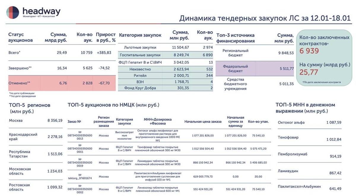 Делимся краткой инфографикой тендерных закупок ЛС за период 19-25 января. Общий объём опубликованных (по дате публикации) аукционов с 19.01 по 25.01 составляет: 🔴29,49 млрд руб., +385% к 12.01-18.01 🔴Количество аукционов 10 759 ✅ Завершённые аукционы (по дате проведения): 🔴16,34 млрд руб., -74,52% к 12.01-18.01 🔴5 625 аукционов ❌ Отменённые аукционы (по дате проведения): 🔴6,76 млрд руб., -67,70% к 12.01-18.01 🔴2 828 аукционов Заключено контрактов (по дате заключения контракта): 🤝6 939 на сумму 25,77 млрд руб. 💊 Структура закупок: Основной объём формируют льготные (11,5 млрд руб.) и госпитальные закупки (8,2 млрд руб.); 💰 Финансирование: Лидирует региональный бюджет - 9,84 млрд руб., а также средства федеральный бюджет - 5,51 млрд руб. На слайде также вы найдёте: ✅топ-5 аукционов по НМЦК; ✅топ-5 регионов по объёму закупок; ✅топ-5 МНН по объему закупок; ✅распределение закупок по категориям (госпитальные, льготные и др.); Надеемся, эта информация будет полезной для вас. П