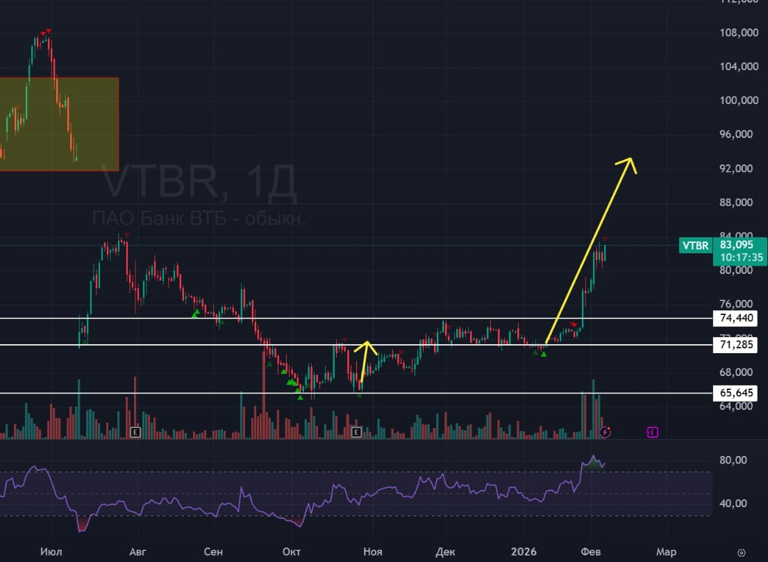 🏦 ВТБ 🟢Последний раз про ВТБ писал 29го декабря, пора обновить ситуацию. Акция вышла из своего накопления, цена уже находится в перекупленности, но здесь не было видно абсолютно никакой слабости пока индекс падал. Сегодня ВТБ снова сильнее рынка, плюсует более 2%. 🟢Свержу открытая область гэпа. В случае пробоя 84 руб за акцию. график может устремиться вверх - закрывать гэп. 🚗 ВТБ жду вверх, потенциал тут есть, сила видна, но конечно напрягает, что крупные блогеры-трейдеры вновь в нее сели, хотя в начале января покидали её, когда она была в накоплении. #втб #vtbr #bogdanoffinvest $VTBR $VBH6 $VBM6