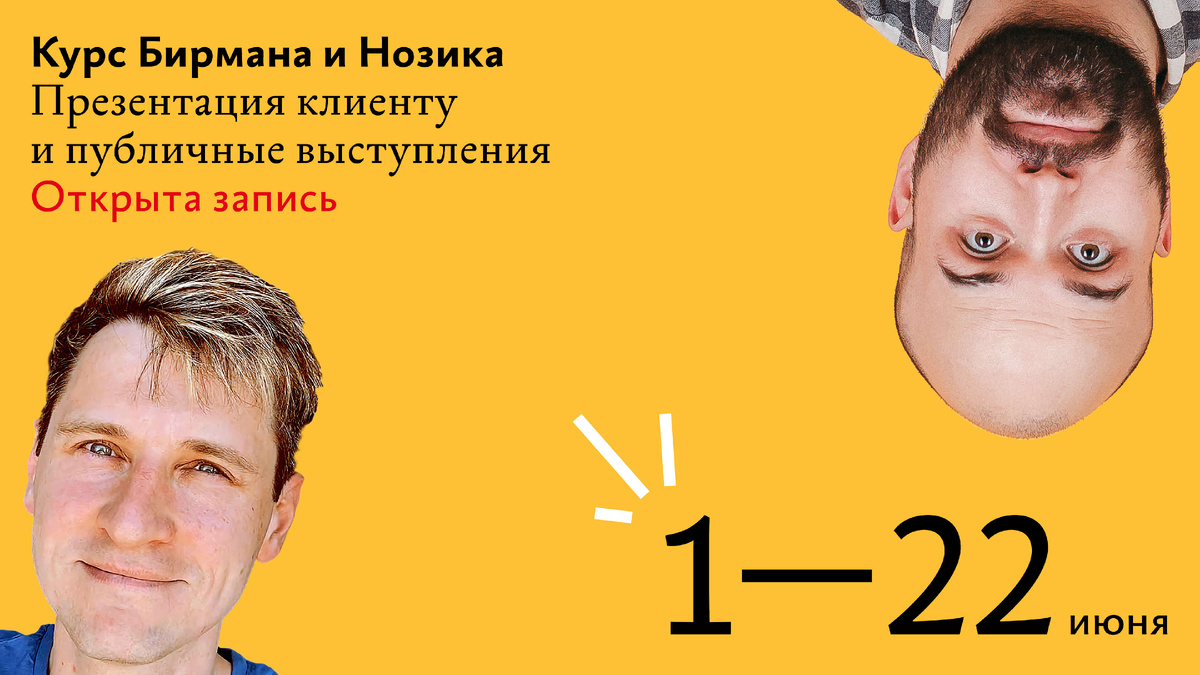 Открыта запись на курс Ильи Бирмана и Михаила Нозика «Презентация клиенту и публичные выступления». Курс длится три недели и пройдёт с 1 по 22 июня в дистанционном формате. До 2 мая стоимость ниже на 30%, позднее — участие станет дороже. Успейте записаться! Дизайн, идея статьи или спецпроекта, маркетинговая стратегия, анализ данных, разработка, — результат долгой работы может быть воспринят без энтузиазма, раскритикован, не понят, если его не презентовать. Задача курса — дать специалистам алгоритм публичных выступлений, который поможет не бояться слушателя и сделать презентацию частью рабочей рутины. Илья и Миша — арт‑директора бюро, презентуют и сдают проекты клиентам более десяти лет (часто с первого раза). Илья регулярно выступает на 404фесте, Дизайн‑просмотре и других конференциях. Помимо вдохновения и рекомендаций участники получат практический опыт проведения презентаций: будут выступать друг перед другом и перед преподавателями, ошибаться, получать обратную связь и совершенствов