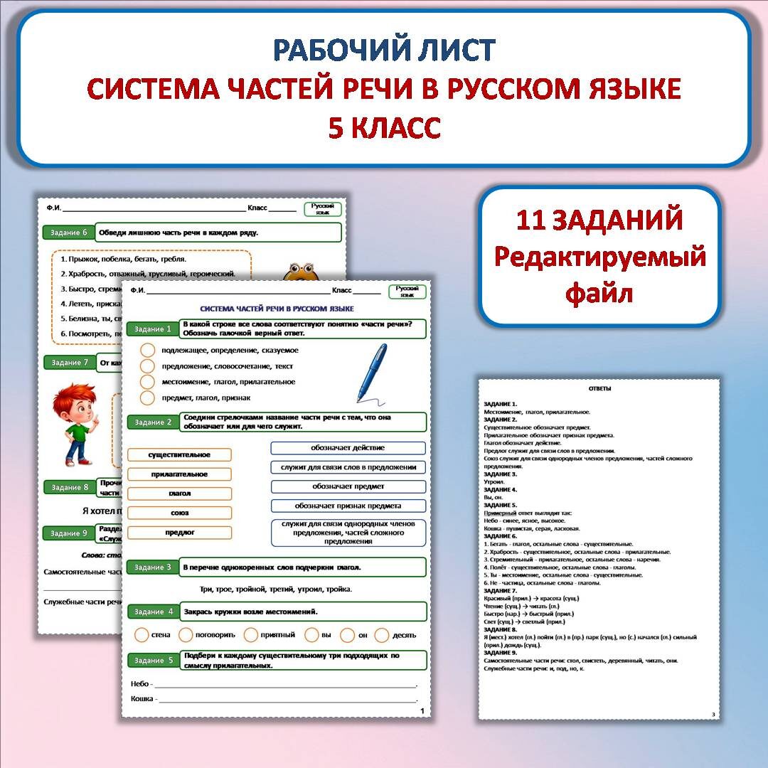 Рабочий лист скачать здесь Презентацию к уроку скачать здесь Рабочий лист «Система частей речи в русском языке» предназначен для уроков русского языка в 5 классе при изучении раздела «Морфология». Рабочий лист состоит из 11 заданий (на двух листах). Имеются ответы к заданиям (на третьем листе). Рабочий лист можно использовать на любом этапе урока русского языка. Учащимся предстоит решить анаграмму, чтобы получить название раздела науки о языке. Школьникам предлагается вспомнить классификацию частей речи, повторить термины «самостоятельные части речи», «служебные части речи», узнать слова разных частей речи, образовать от предложенных слов другие части речи, найти четвёртое лишнее. Данная разработка будет полезна не только для работы на уроке, но и для дистанционного обучения, и для самостоятельного изучения темы учащимися. Нестандартные задания этого рабочего листа разнообразят урок и поддержат интерес учащихся к теме «Система частей речи в русском языке». Материал подготовлен к печати