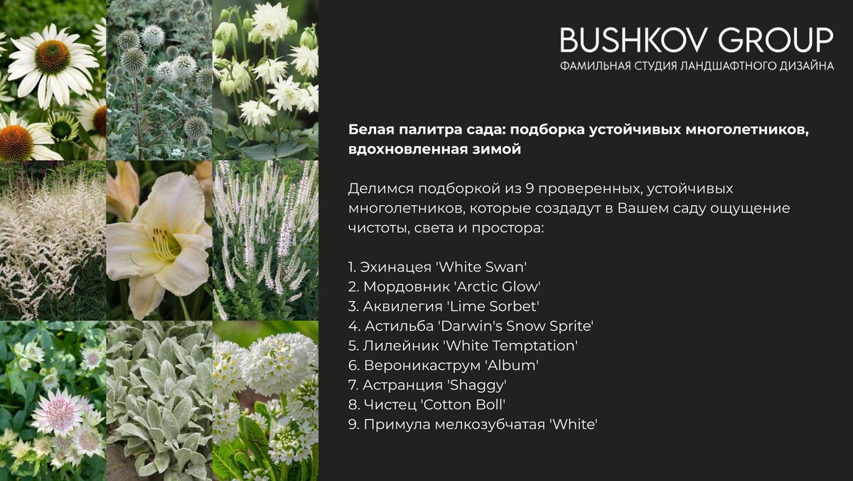 Создание эффектного, светлого и при этом практичного сада, который будет стабильно декоративен из года в год, - достижимая задача. Представленная подборка многолетников служит готовым конструктором для такого пространства. Специалисты студии BUSHKOV GROUP готовы помочь Вам на всех этапах: от разработки индивидуальной концепции белого сада и точного подбора сортов до профессионального воплощения проекта на Вашем участке. Готовы создать свой сияющий белый сад? Обращайтесь за консультацией.
