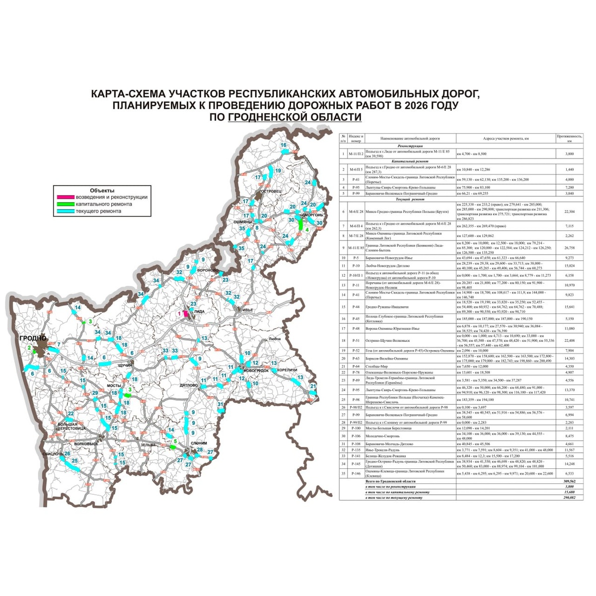 Какие дороги в планах капитальной реконструкции В 2026 году в Беларуси планируется ремонт около 5,2 тыс. км республиканских и местных автомобильных дорог. Об этом сообщили «Гродненской правде» в Министерстве транспорта и коммуникаций. Из них 1 853 км составят республиканские трассы, еще 3 338 км — местные дороги. На 714 км предусмотрено устройство усовершенствованного покрытия, в том числе на дорогах, ведущих к агрогородкам. В Гродненской области в 2026 году отремонтируют почти 310 км дорог. Запланирована реконструкция трассы М-11/П2 — подъезда к Лиде от дороги М-11/Е85. Капитальный ремонт проведут на следующих направлениях: 🤩 М-6/П5 — подъезд к Гродно от дороги М-6/Е28; 🤩 Р-41 Слоним — Мосты — Скидель — граница Литовской Республики (Поречье); 🤩 Р-95 Лынтупы — Свирь — Сморгонь 🤩 Крево — Гольшаны; 🤩 Р-99 Барановичи — Волковыск — Пограничный — Гродно. Информация о местах текущего ремонта размещена на карте-схеме, опубликованной Министерством транспорта и коммуникаций.