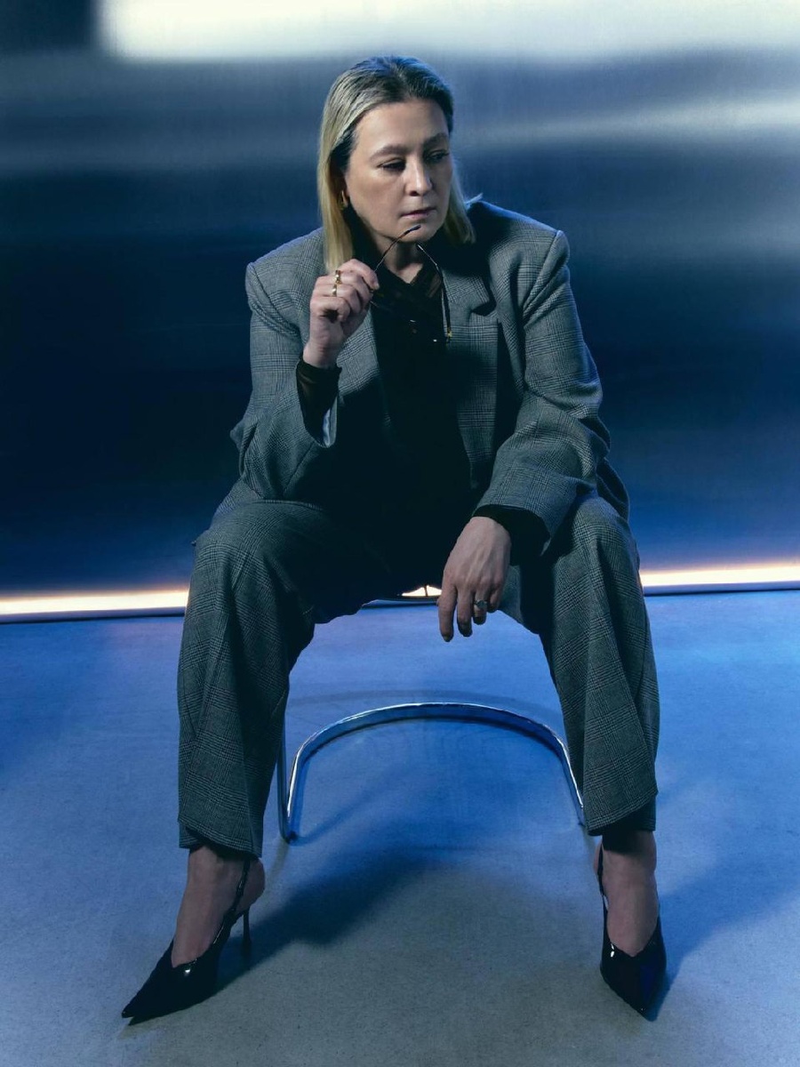 Здесь, среди металла и холодного синего света, Маша Федорова и костюм ДИТРИХ встретились вновь — жакет в клетку с замшевой отделкой, брюки со стрелками и юбка Маша умело миксует их с графичной полоской рубашки и полупрозрачностью лонгслива с драпировками