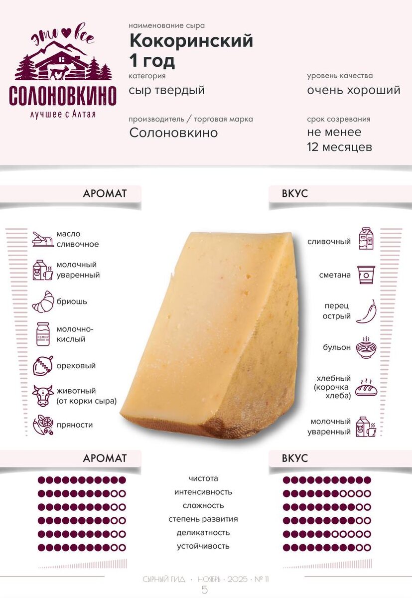 Сегодня более детально познакомимся с одним из российских производителей - Солоновкино, с. Солоновка, Алтайский край. В ассортименте данного производителя более 60 наименований различных видов сыра. Разберем некоторые образцы твердого сыра. • Кокоринский 1 год Яркая, сложная и устойчивая ароматика и вкус со сливочно-бриошной компонентой. Во вкусе хороший баланс, остринка и выраженный умами. Консистенция - плотная, твердая, с кристаллами. Варианты употребления - в составе сырной тарелки, самостоятельно, в составе холодных блюд.