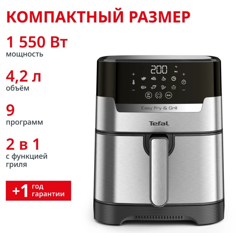 Для бюджетного варианта рассмотрите аэрогриль Tefal Easy Fry Compact EY145810. Он предлагает базовые функции в компактном и доступном формате.