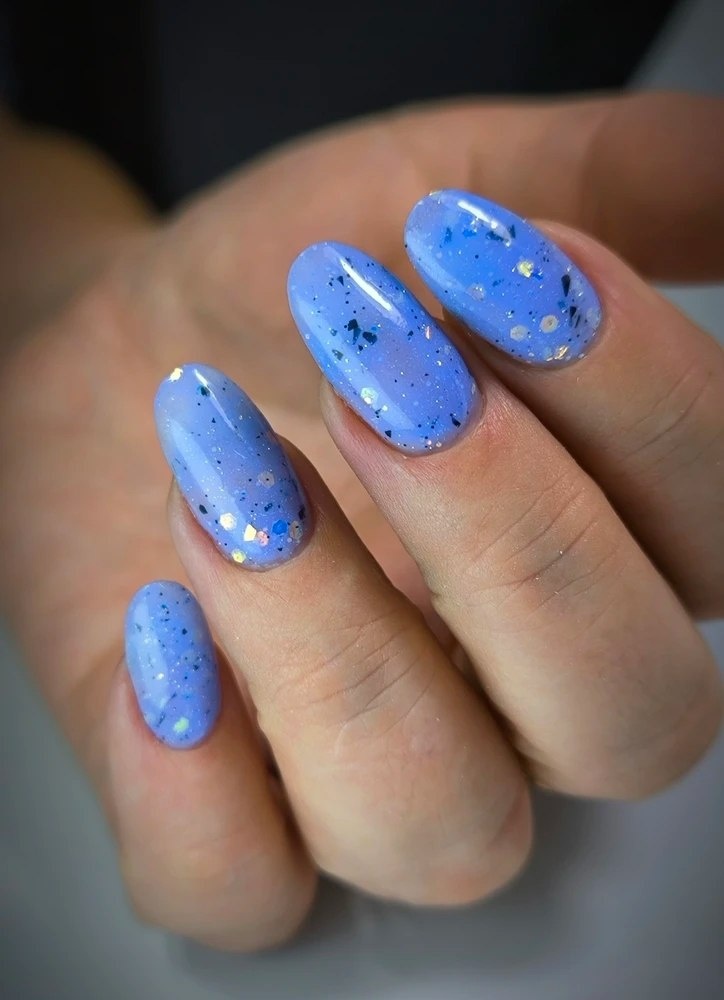 По поверхности рассыпаны мелкие вкрапления: тёмные крапинки и деликатный шиммер с холодным переливом — от серебристого до едва заметного голубого. Блёстки не кричащие, а аккуратные, будто пыльца или крошечные льдинки, пойманные в цвете. Такой цвет красиво подчёркивает форму ногтей, подходит для повседневного образа и при этом не выглядит скучно — за счёт глубины и живой текстуры. https://www.wildberries.ru/catalog/208664897/detail.aspx