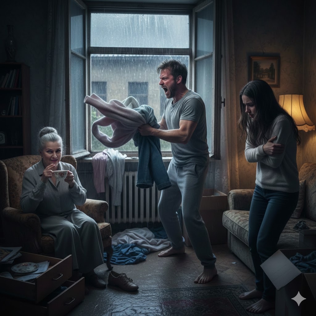 Я спускалась по лестнице, и каждый шаг отдавался болью в висках. Выйдя во двор, я увидела свои вещи, разбросанные по мокрому асфальту. Соседка из первого подъезда, тетя Валя, стояла с зонтом и с жалостью смотрела на этот погром.