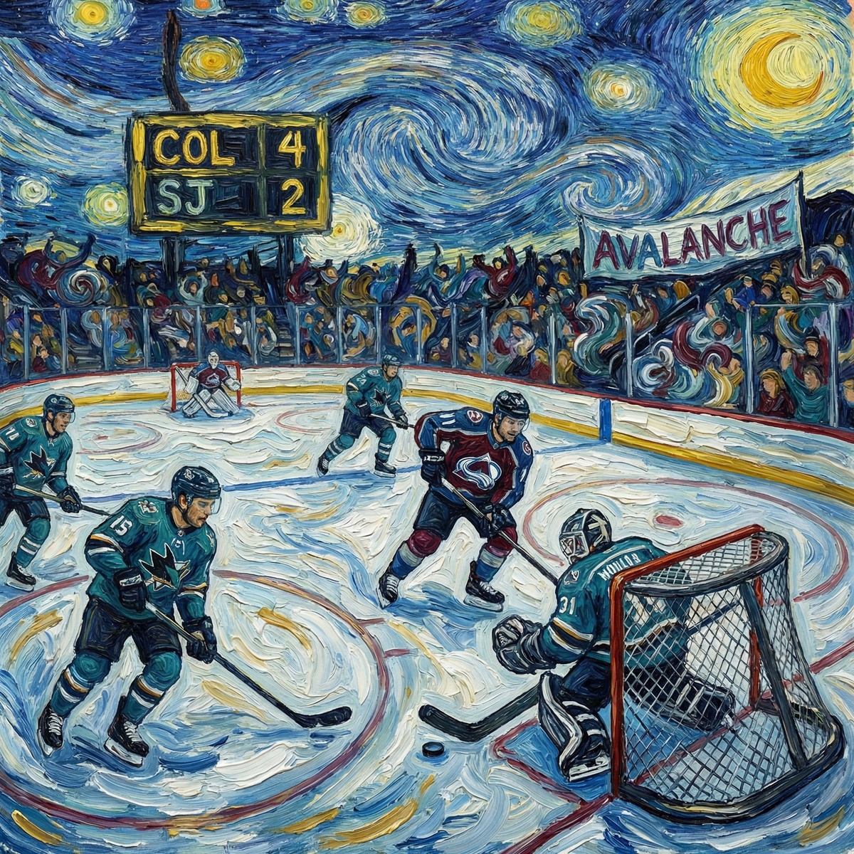 Хорошо, что Эвеланш лишь одну шайбу забросили. Ясное дело, что при бросковой "засухе" у Шаркс голов не было. До второго перерыва "лавина" сумела добыть преимущество в две шайбы, которое за первые минуты решающей двадцатиминутки гости свели к нулю. И всё-таки лидеры регулярного сезона оказались сильней - за семь минут до сирены вышли вперёд и укрепили лидерство голом в пустые ворота - 4:2. В стиле Ван Гога.