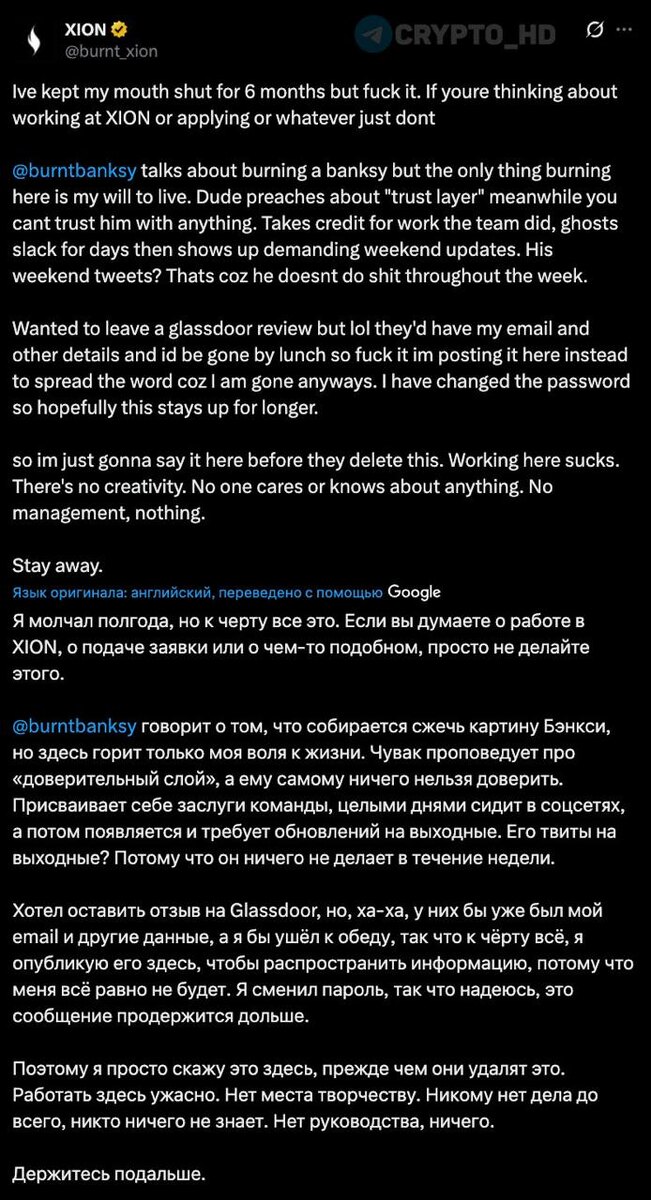 Кто-то из команды XION раскритиковал основателя проекта о официальном Twitter-аккаунте. Понимая, что после этого все равно вылетит, решил ничего не скрывать. Суть претензий: ➤ Фаундер присваивает чужие заслуги. ➤ Пропадает из рабочих чатов на несколько дней, потом требует отчеты в выходные. ➤ Активен в Twitter по субботам, потому что всю неделю бездельничает. ➤ В компании полный хаос, никакого менеджмента. Хотел оставить отзыв на Glassdoor, но там светится email – быстро уволят. Поэтому залил через пост в Twitter и сменил пароль, чтобы подольше висел. Crypto Headlines