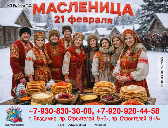 Хватит сидеть дома. Удивительные зимние впечатления ждут вас. 21 февраля отправляемся вместе с Твой Тур на широкую Масленицу за яркими эмоциями, весёлыми играми и ароматными русскими блинами. Масленица в Усадьбе Кописки «Богдарня» (Владимирская область, Петушинский район, д. Крутово). Масленица в семейной усадьбе «Богдарня» Семейная усадьба «Богдарня» приглашает весело провести праздничные дни. По древней традиции мы с вами проводим зиму в атмосфере исконного русского духа и ощутим дыхание наступающей весны. В программе: Русские сыры Стоимость с выездом из Владимира: взрослый/ребёнок – 4100/4000 руб. с человека.Стоимость с выездом из городов Владимирской области: взрослый/ребёнок – 5500/5400 руб. с человека. Масленица на Соляном острове (Ярославская область, п. Некрасовское). Отправьтесь с Твой Тур навстречу весне и запоминающимся впечатлениям – на зимний праздник в Ярославской области. Масленица на Соляном острове Что ожидает наших гостей: Самовар поспел Стоимость с выездом из Владими