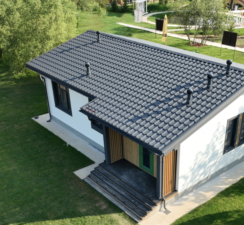 - Зеленые тона (пример: RAL 6005 Моховой зеленый): Металлочерепица в зеленых оттенках демонстрирует стабильный интерес покупателей. Она прекрасно сочетается с природным окружением и ландшафтным дизайном.