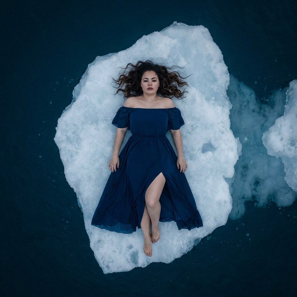 😀Выбираем "нейросети" 😀Нажимаем "Nano Banana" 😀Нажимаем "Nano Banana Pro" 😀Прикрепляем через скрепку свое фото и выбранный промпт 😀Наслаждаемся результатом😍 Создай фото не меняя черты лица. Макияж безупречный.Вид сверху: женщина в струящемся темно‑синем платье с открытыми плечами и высоким разрезом лежит на куске льда посреди тёмно‑синего моря. Волнистые распущенные волосы вокруг головы, босые ноги, мягкий драматический свет, сильный контраст, кинематографичная цветокоррекция, лёгкий ветер, атмосферное одиночество. #женские@annapromtii20