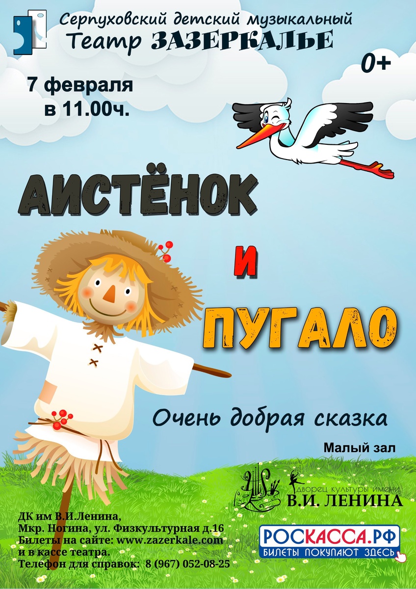 ✨ «Аистёнок и Пугало» Маленький раненый аистёнок и одинокое Пугало, забытое в поле... Казалось бы, что у них общего? Но именно их встреча научит зрителей самому главному: истинная забота и любовь могут родиться там, где их совсем не ждёшь. 🚫 Возраст: 0+ 📆 07.02.2026 🕒 11:00 🏢 Серпуховский детский музыкальный театр "Зазеркалье" 📍 г. Серпухов, мкр-н Ногина, ул. Физкультурная, 16 в ДК им. В. И. Ленина 💰 Цена от: 500 до 600 ₽ 🎫 Купить билет: https://zazerkale.com/ ⭐Поддержать канал голосом 💰 Канал Вакансии Серпухова ✅ Мероприятия Серпухов https://dzen.ru/id/66f01c6eb4c6fe60c9ca1608 http://vk.com/serpukhov_events http://dzen.ru/serpukhov_events